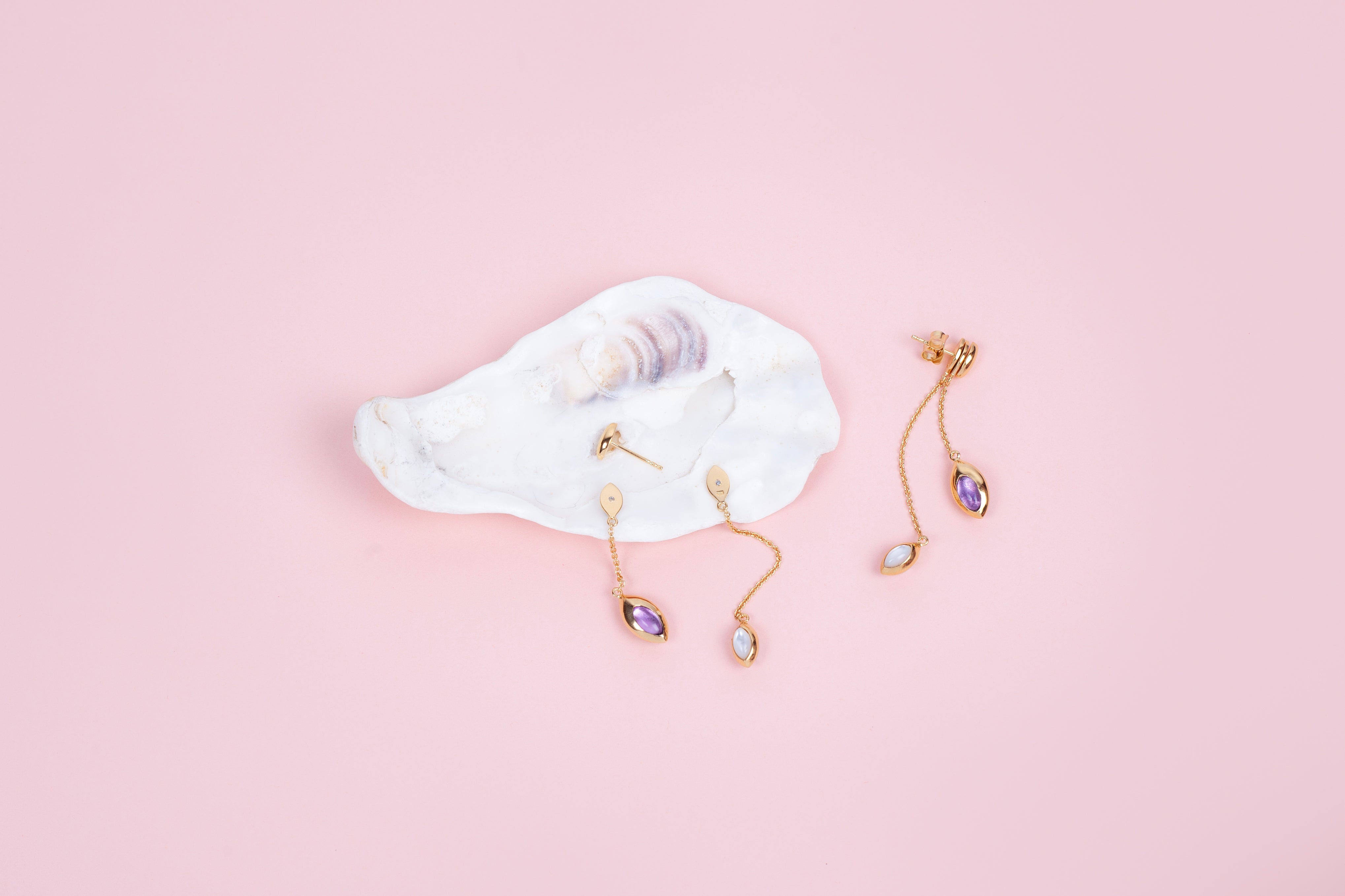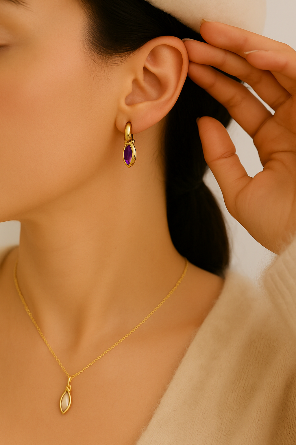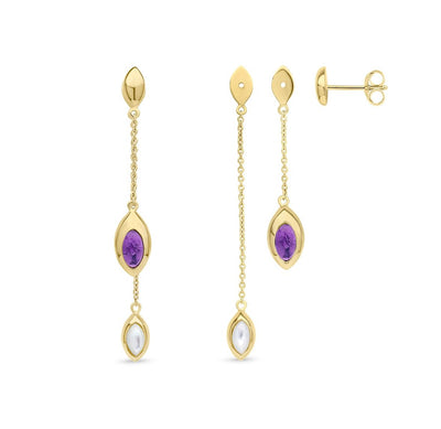 The Amara Twin Earrings offer elegant versatility in a refined design. Each drop earring features detachable amethyst and mother of pearl charms. Wear them solo or paired for a luminous contrast. Lightweight and graceful, they bring timeless beauty to both everyday and elevated looks.